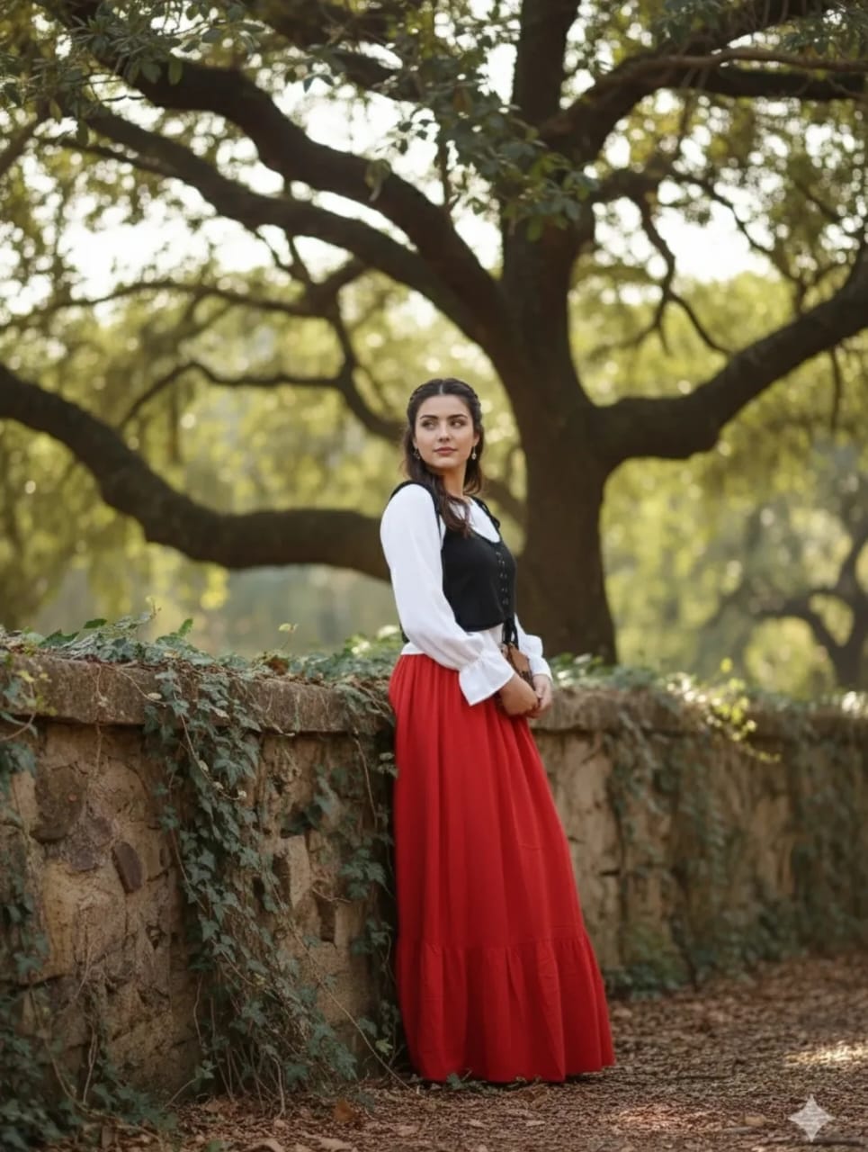 This trendy three-piece outfit features a bold red skirt paired with a clean white top and finished...
